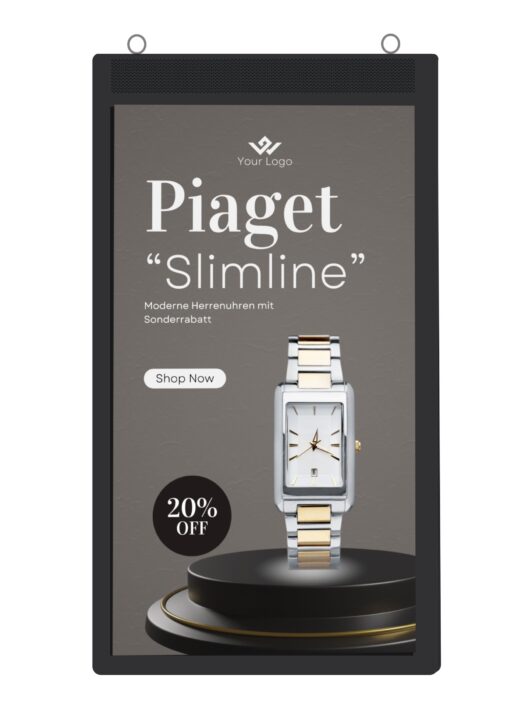Das Display ist für den 24/7-Betrieb ausgelegt und verfügt über ein robustes Gehäuse aus Metall und Aluminium mit Ösen für eine hängende Montage an Drahtseilen. Es ieignet sich ideal für den Einsatz in öffentlichen Bereichen, Einzelhandelsgeschäften oder Transportzentren.