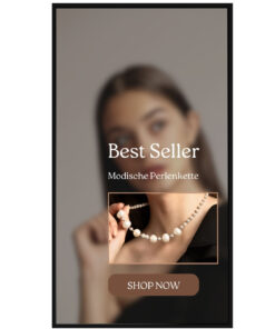 Das Display ist für den 24/7-Betrieb ausgelegt und verfügt über ein robustes Gehäuse aus Metall und Aluminium mit laminiertem Glas. Es ist für die Wandmontage konzipiert und eignet sich ideal für den Einsatz in öffentlichen Bereichen, Einzelhandelsgeschäften und anderen Einsatzgebieten. Optional kann das Display mit individuell gefertigten Adaptern auch für eine vielfältigere Montageart vorbereitet werden.